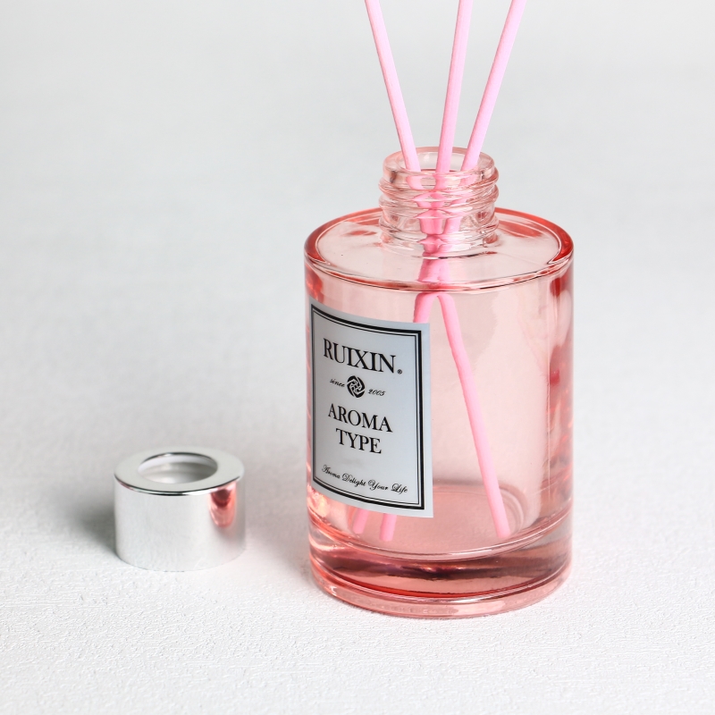 زجاجات ناشرة زجاجية باللون الوردي مع ملصقات وأغطية