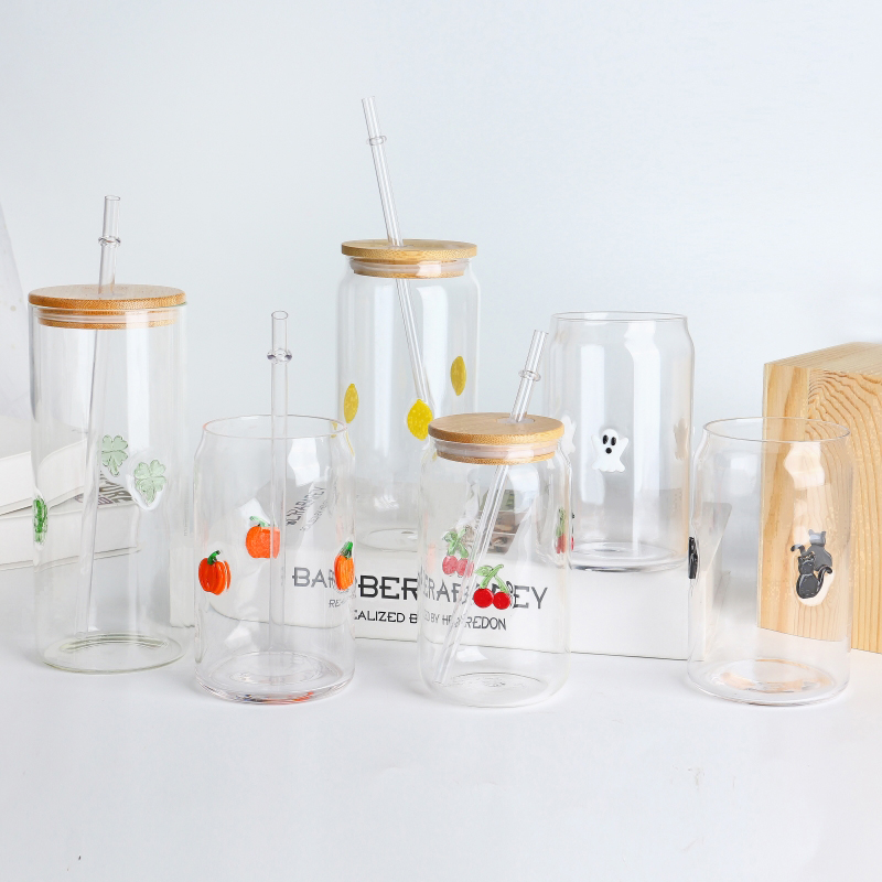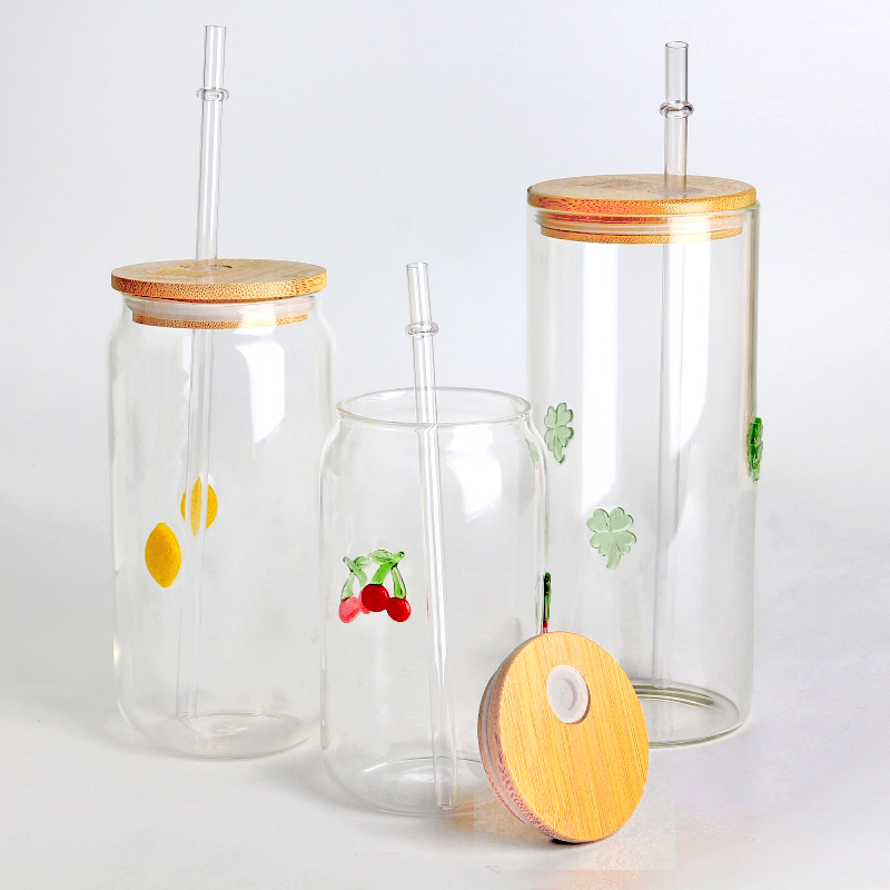 قابلة لإعادة الاستخدام صديقة للبيئة واضحة ثلاثية الأبعاد ترصيع الليمون ديكور 16 أوقية 500 مللي كأس زجاجي للشرب مع غطاء من الخيزران للعصائر