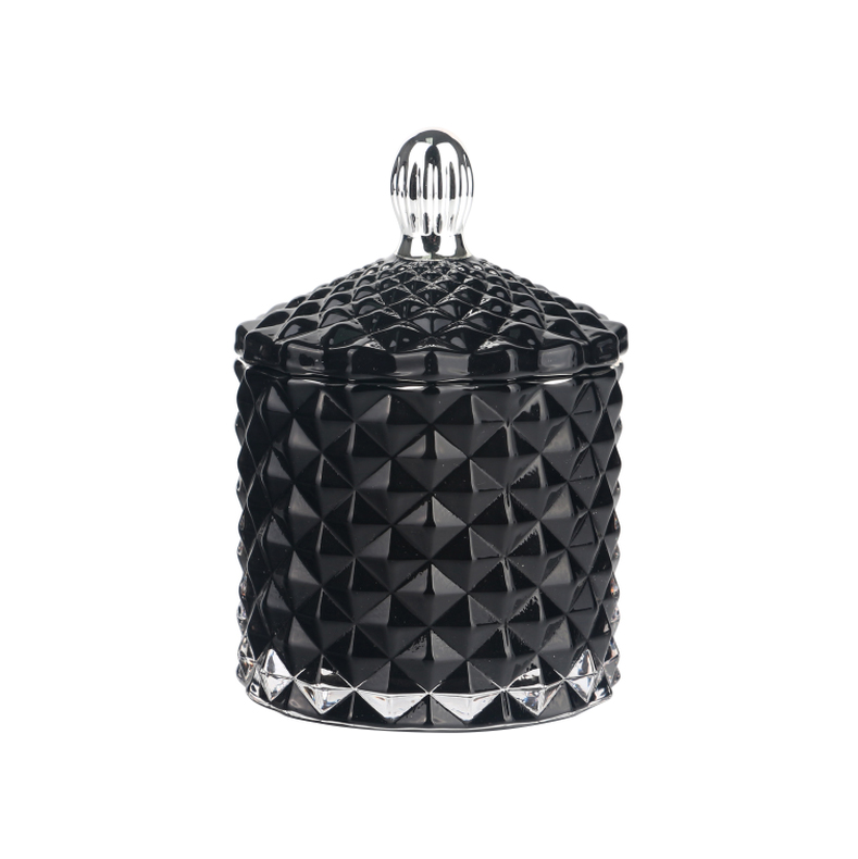 Tarro de vela de cristal geocortado interior negro con tapa con punta plateada