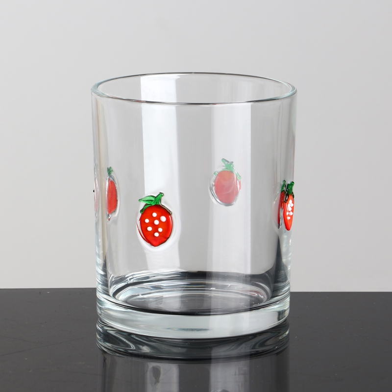 Contenitore per candele in vetro vuoto con decorazione personalizzata con intarsio di fragole