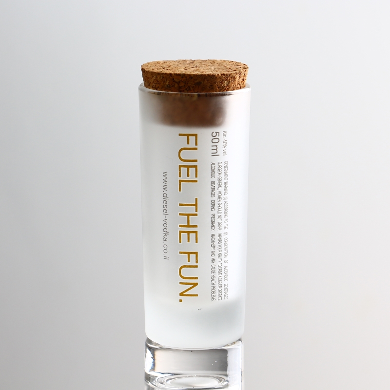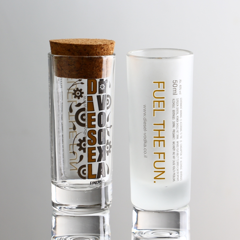 맞춤형 데칼 인쇄 프로스트로드 완성 된 1oz 샷 유리로 장식 된 나무 스토퍼로 장식
