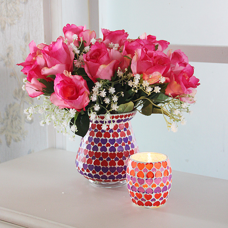 키가 큰 촛대 스테인드 글라스 캔들 홀더 제조 업체, 빨간색과 파란색 심장 모양의 유리 꽃병