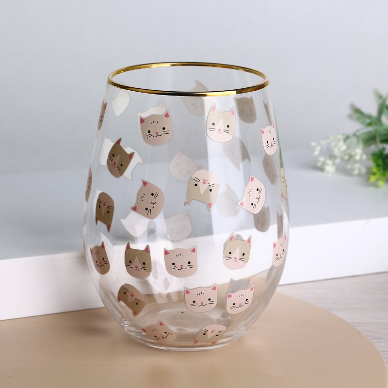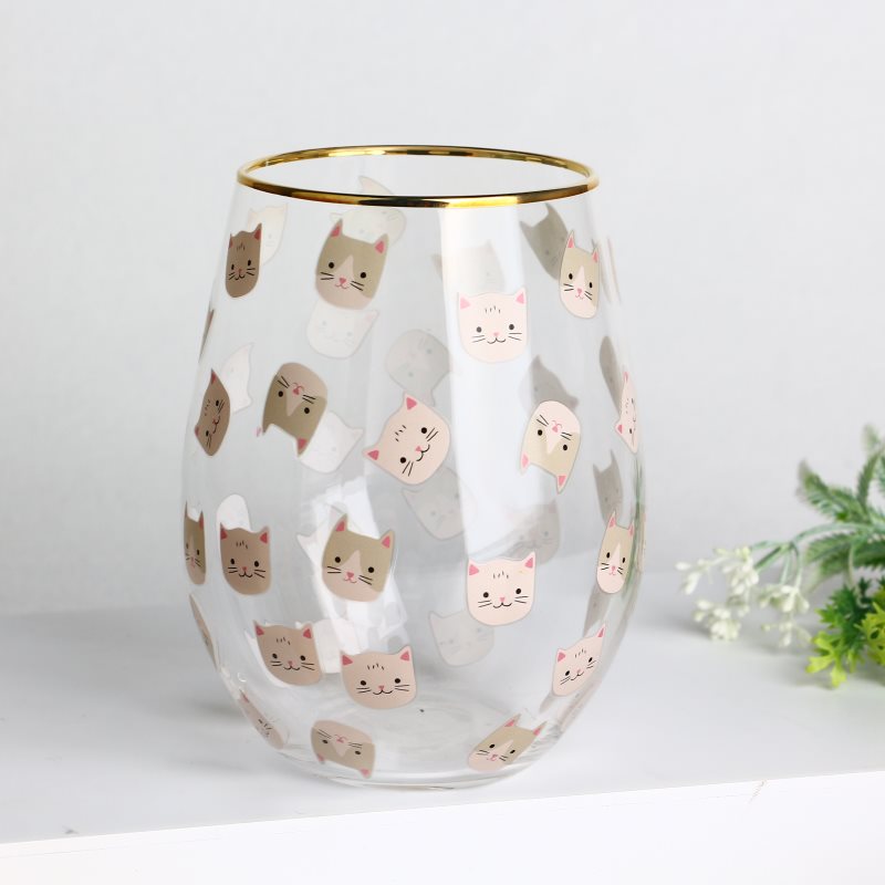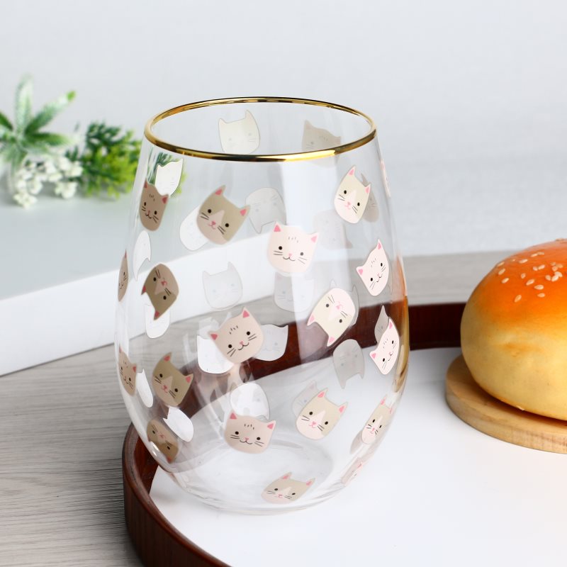 고양이 패턴 데칼과 함께 금색 림 스템리스 와인 유리 컵