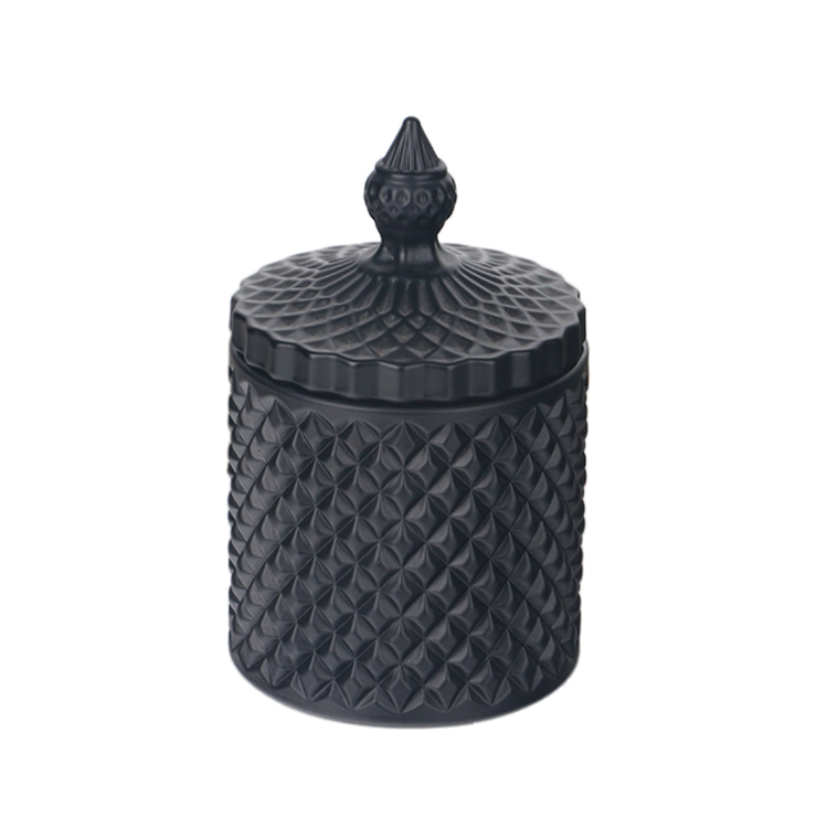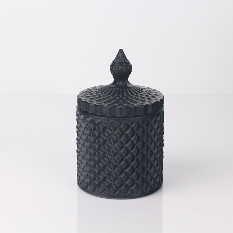 Colored opaque black matte geo cut glass candle jar with lid
