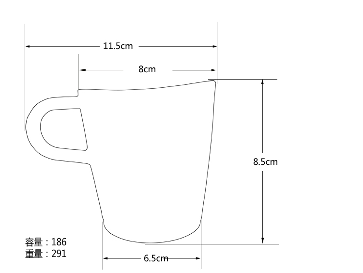 T:8cm, B:6.5cm, H:8.5cm, W:291g, C:186ml