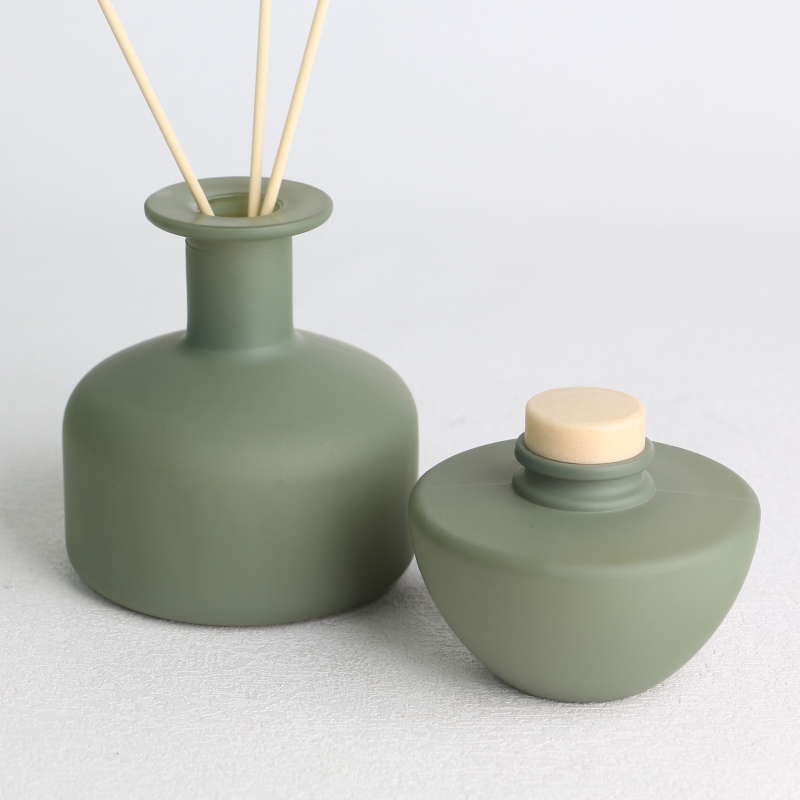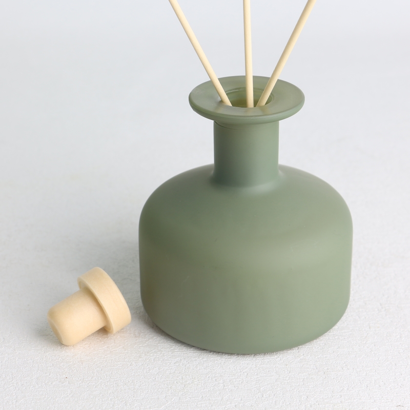 Conjunto de frasco difusor de vidro pulverizado opaco fosco verde ervilha com tampas de madeira