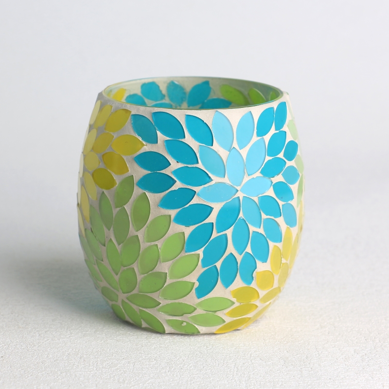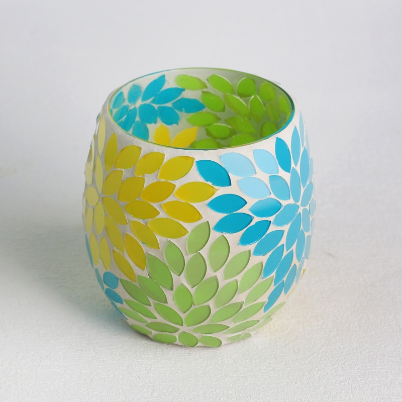 frasco de vela com superfície de mosaico de vidro esquema de cores amarelo verde azul