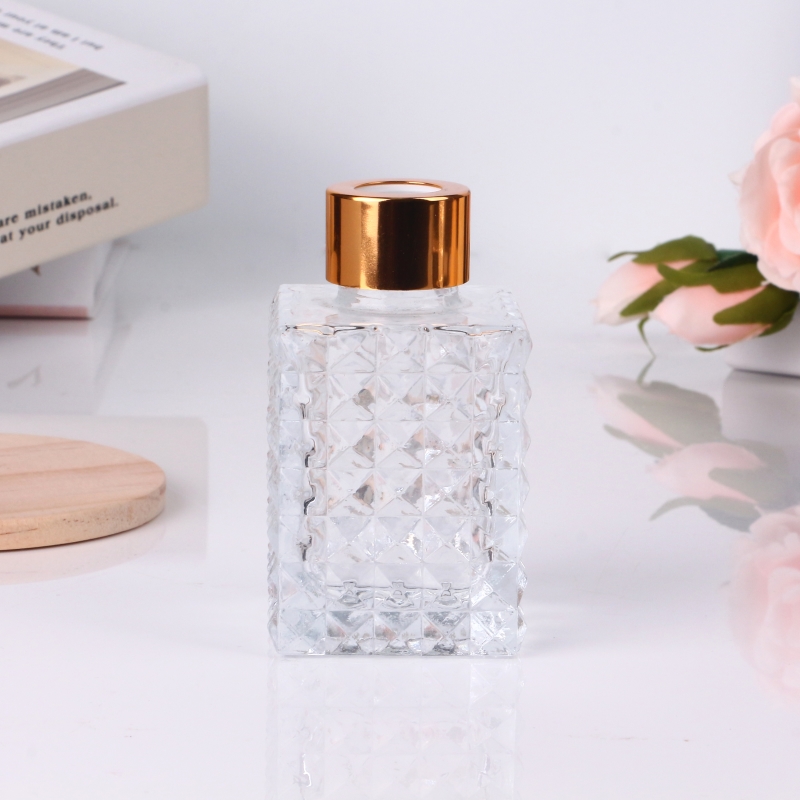 100ml 3.5oz geo kesim kare şeffaf cam difüzör şişesi, altın vidalı kapaklı